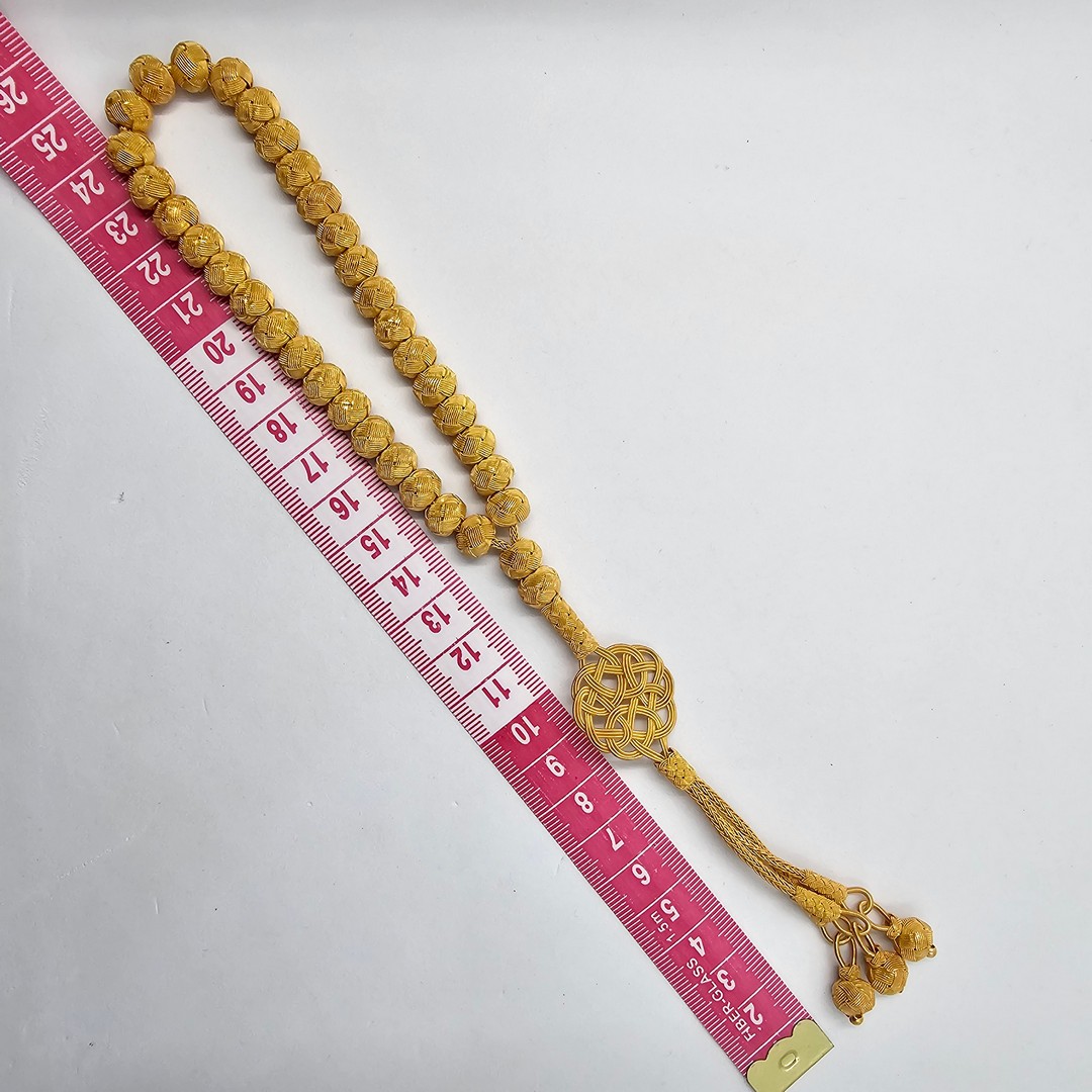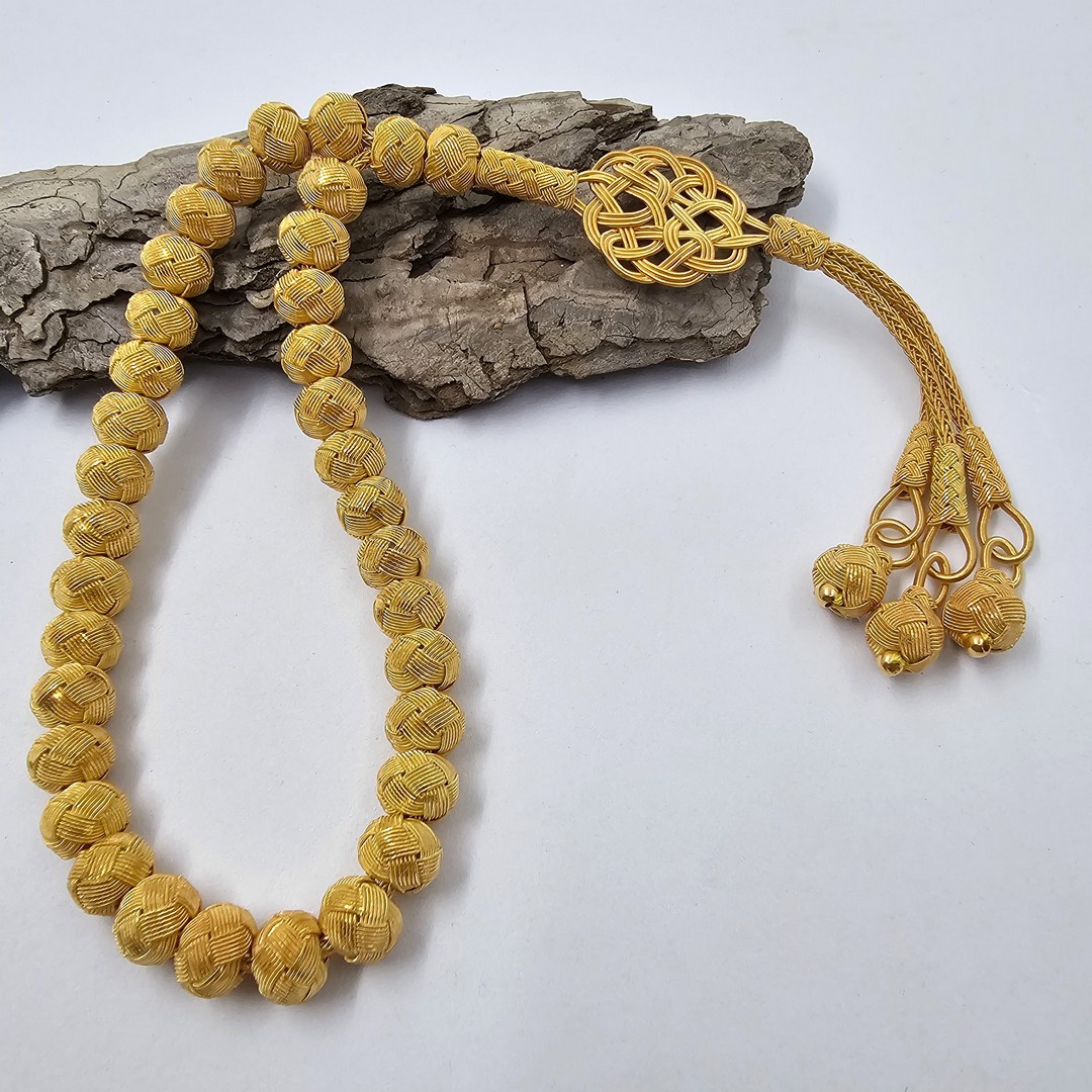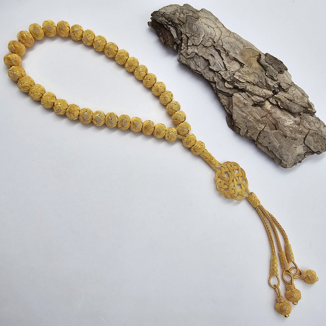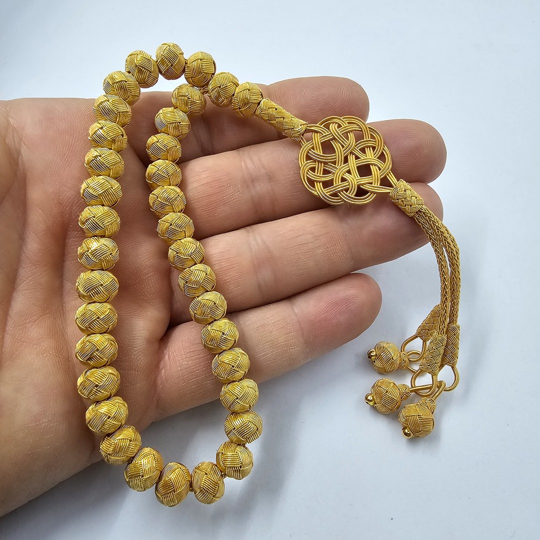 Her bir detay, ustaların özenle işlediği el örgüsü teknikleriyle bezenmiştir. Altın kaplama, tesbihe hem parlaklık hem de şıklık katar. Bu tesbih, hem manevi bir obje olarak kullanılabilir hem de şık bir aksesuar olarak kombinlenebilir. Günlük kullanımda rahatlık sağlarken, özel günlerde de şıklığınızı tamamlayacak zarif bir seçenektir.