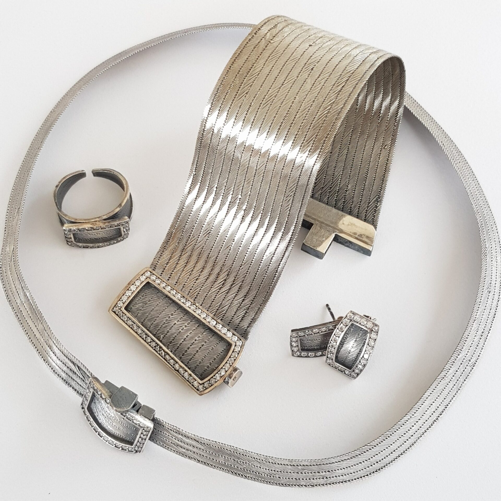 Şıklığınızı tamamlayacak 925 Ayar Gümüş Trabzon Hasır Set Oksit Gri, 925 ayar gümüşten özenle üretilmiştir. Trabzon hasır örgüsü ve oksit gri tonuyla dikkat çeken bu set, el işçiliğiyle işlenen her bir parçasıyla eşsiz bir koleksiyon. Gümüş toka çevresine parlak taşlar yerleştirilmiştir.