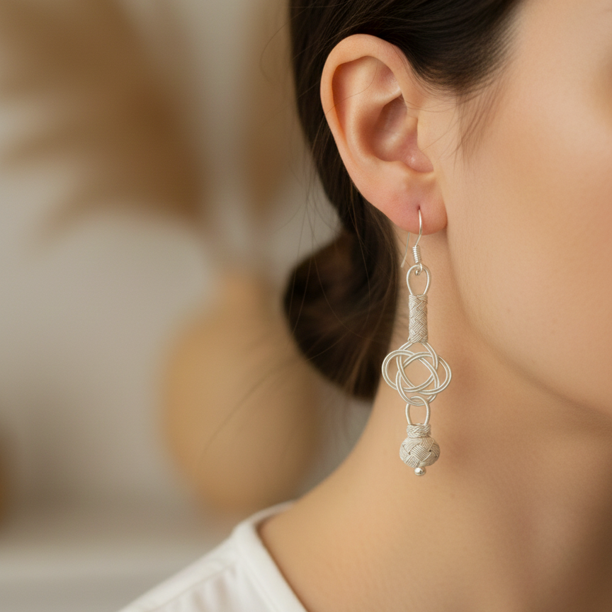 Bu küpe, geleneksel Kazaziye sanatının ustalıkla uygulandığı bir el işçiliği şaheseri. İnce gümüş tellerin örülmesiyle oluşturulan bu teknik, Aşk Düğümü motifine eşsiz bir doku ve üç boyutlu bir derinlik kazandırıyor. Her bir küpe, bu özenli dokunuş sayesinde fabrikasyon ürünlerde bulunamayacak bir karakter ve sıcaklık taşıyor.