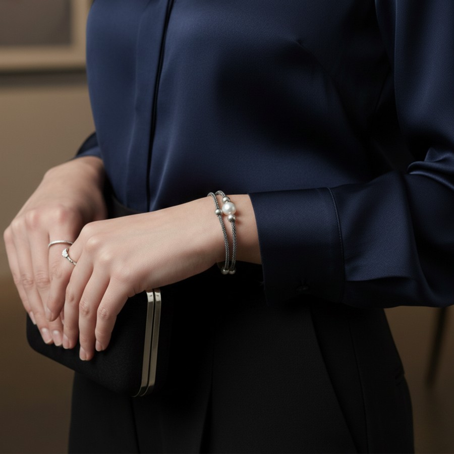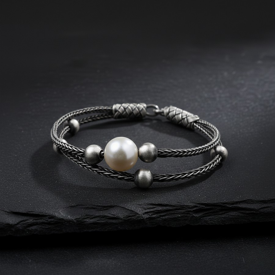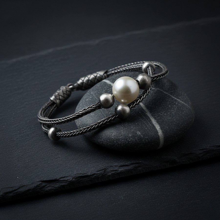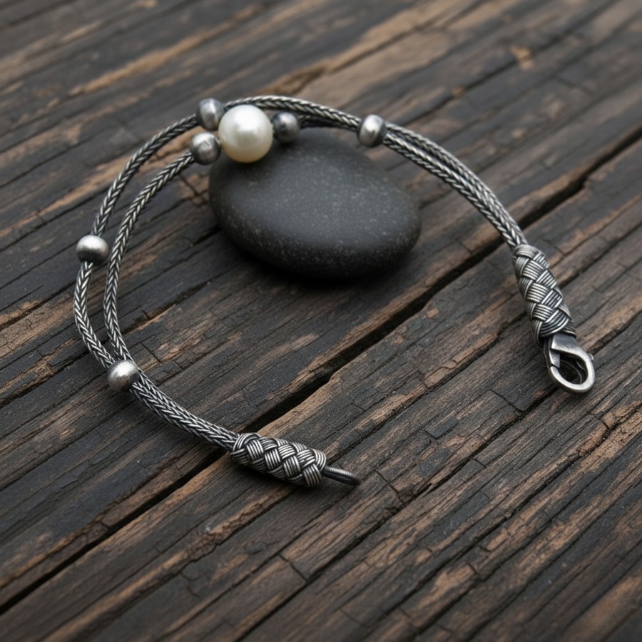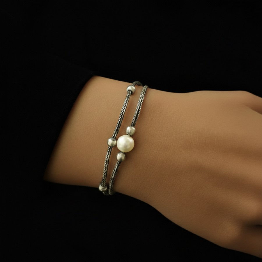 Eskitme Gri Tek İnci Dorika Gümüş Kazaziye Bileklik, Türk el sanatlarının en özel tekniklerinden biri olan Kazaziye ile üretilmiştir. 999 ayar saf gümüş kullanılarak hazırlanan bu bileklik, tek inci detayı ve eskitme gri tonlarıyla modern ve minimalist bir tarz sunar.