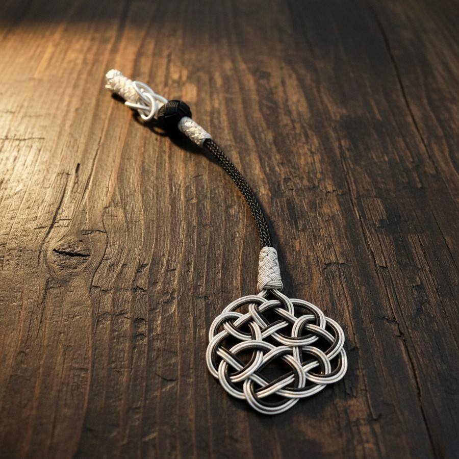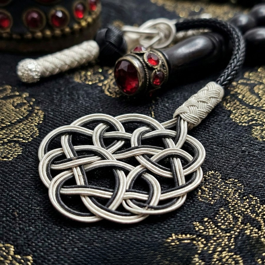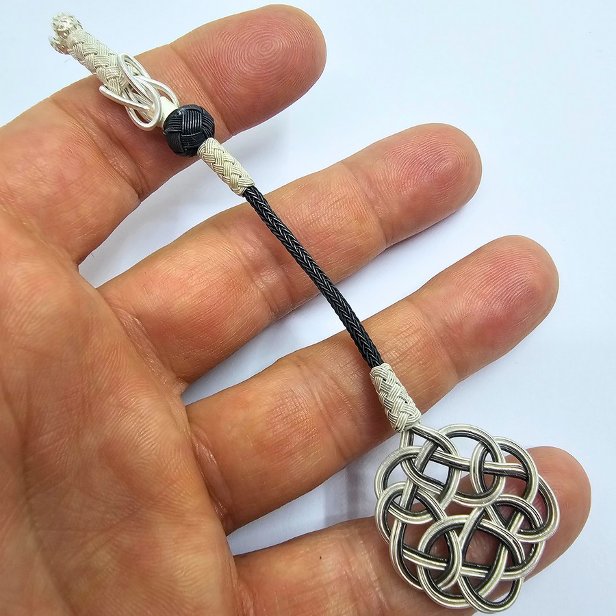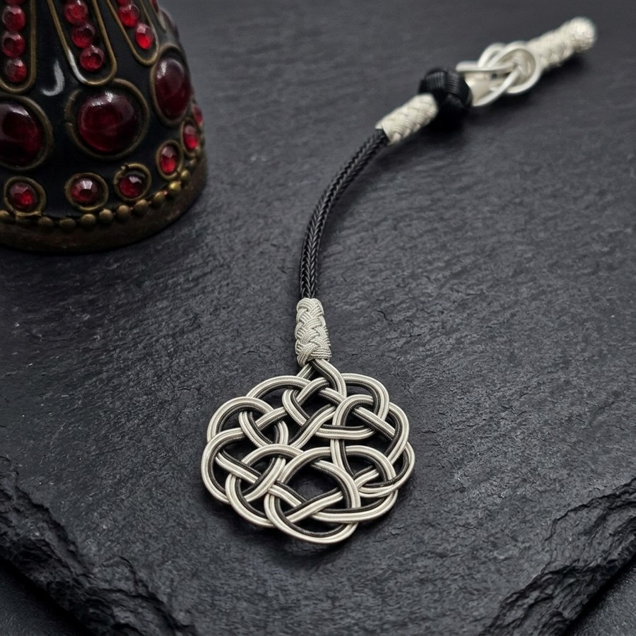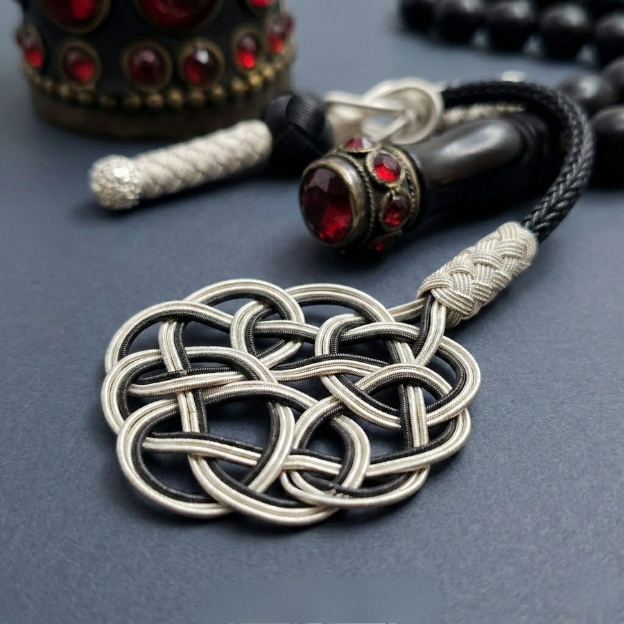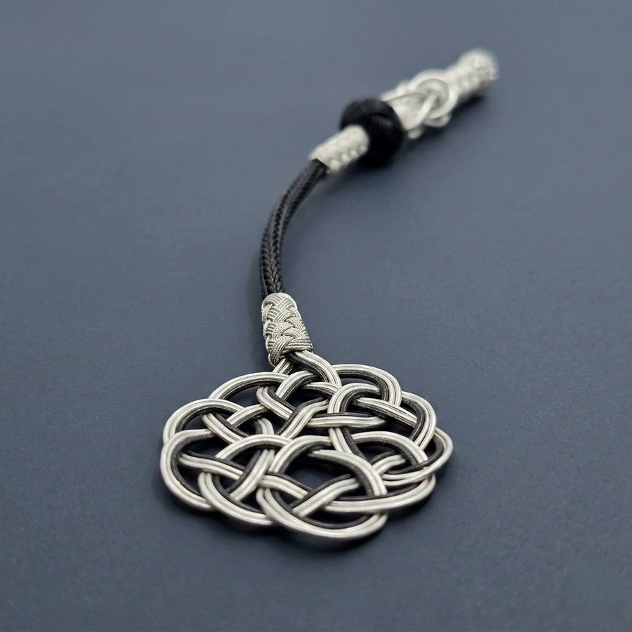Püskülün merkezinde yer alan Aşk Düğümü (Trinity Knot) motifi, Kelt kültüründen gelen ve sonsuz sevgi, bağlılık ile ruhsal birlikteliği simgeleyen kadim bir semboldür. Bu motifin siyah ve beyaz kontrastıyla işlenmesi, geleneksel tespih aksesuarına modern ve cesur bir yorum katar. Siyah oksit kaplama ile parlak gümüşün bir arada kullanımı, Aşk Düğümü’nün hatlarını daha belirgin ve etkileyici hale getirir.