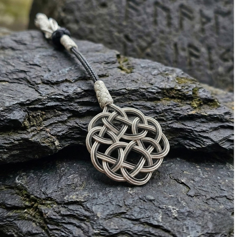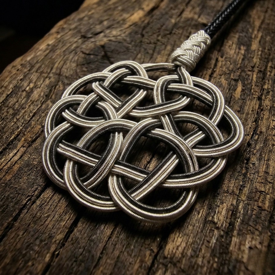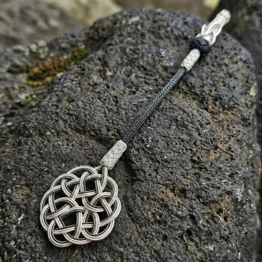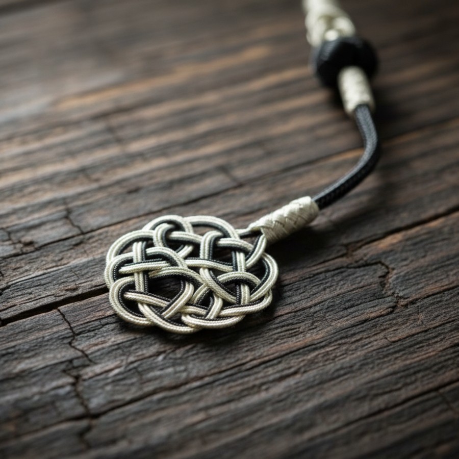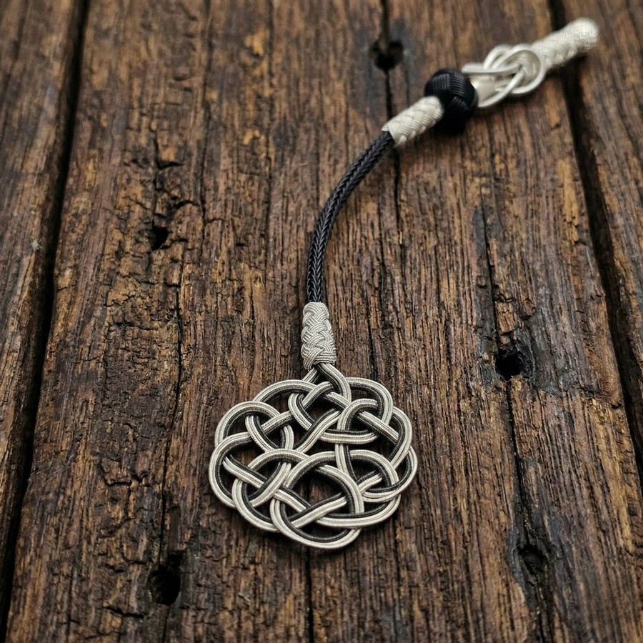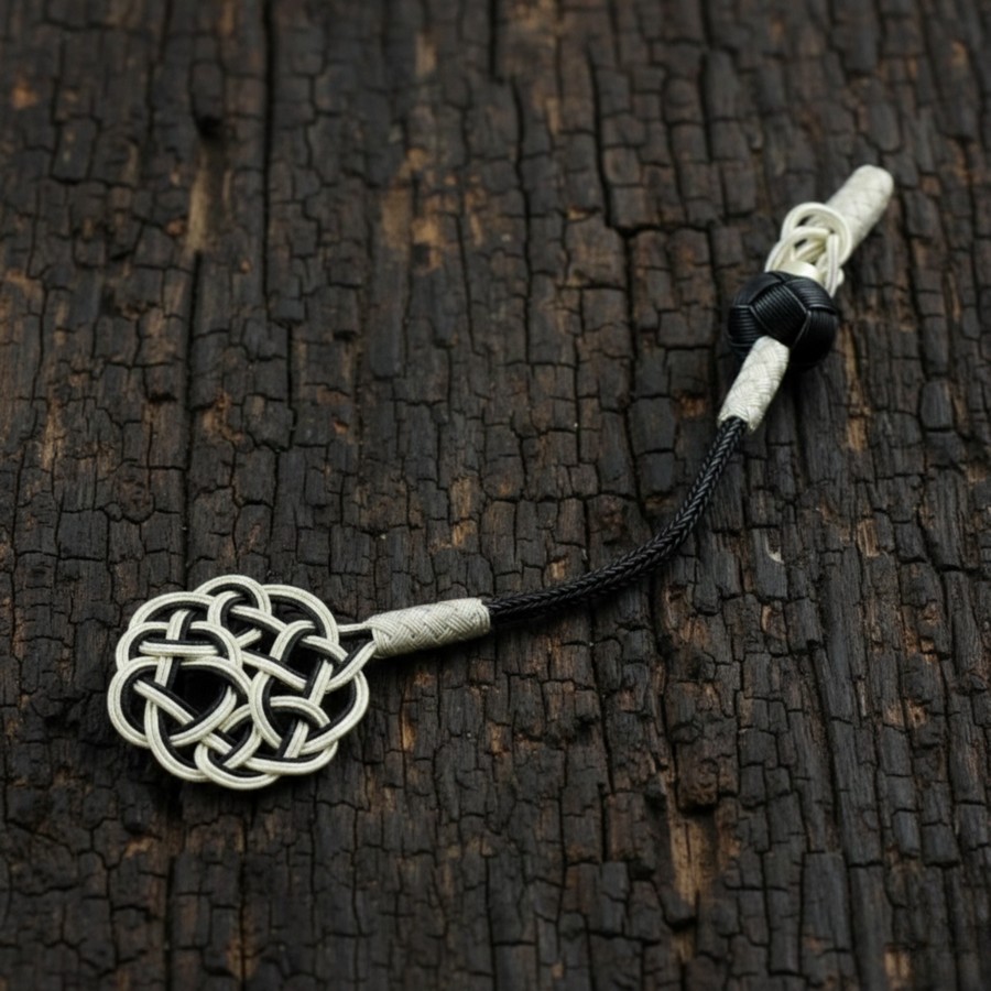 Püskülün merkezinde yer alan Aşk Düğümü (Trinity Knot) motifi, Kelt kültüründen gelen ve sonsuz sevgi, bağlılık ile ruhsal birlikteliği simgeleyen kadim bir semboldür. Bu motifin siyah ve beyaz kontrastıyla işlenmesi, geleneksel tespih aksesuarına modern ve cesur bir yorum katar. Siyah oksit kaplama ile parlak gümüşün bir arada kullanımı, Aşk Düğümü’nün hatlarını daha belirgin ve etkileyici hale getirir.