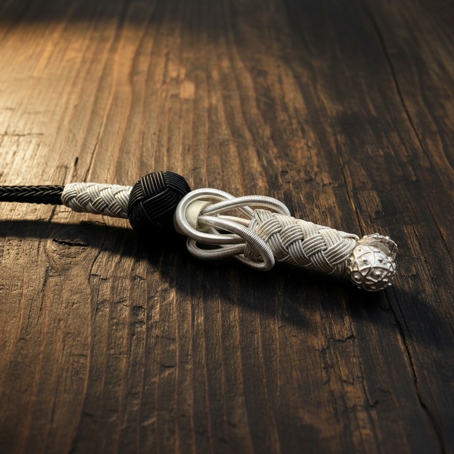 Gümüş Kazaz Püskül Tekli Siyah Beyaz Aşk Düğümü, geleneksel tespih kültürünü zenginleştiren, özel olarak tasarlanmış bir tespih aksesuarıdır. Bu püskül, 999 ayar saf gümüşten (0.999 saflık) kazaz işçiliğiyle (ince gümüş tellerin örülmesi) usta ellerde şekillendirilmiştir. Yaklaşık 6-7 gram ağırlığındaki bu özel parça, tespihinize eklediğinizde ne çok hafif ne de ağır, ideal bir denge sunar.