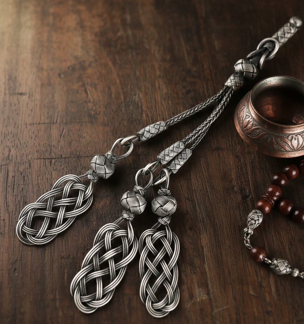Bu özel püskül, 999 ayar saf gümüşün kazaziye sanatıyla buluştuğu bir şaheserdir. Eskitme gri yüzeyi ve kamçı formuyla geleneksel tasarımlardan farklılaşan bu ürün, üçlü püskül yapısıyla tesbihlerinize hareketli bir görünüm kazandırır.