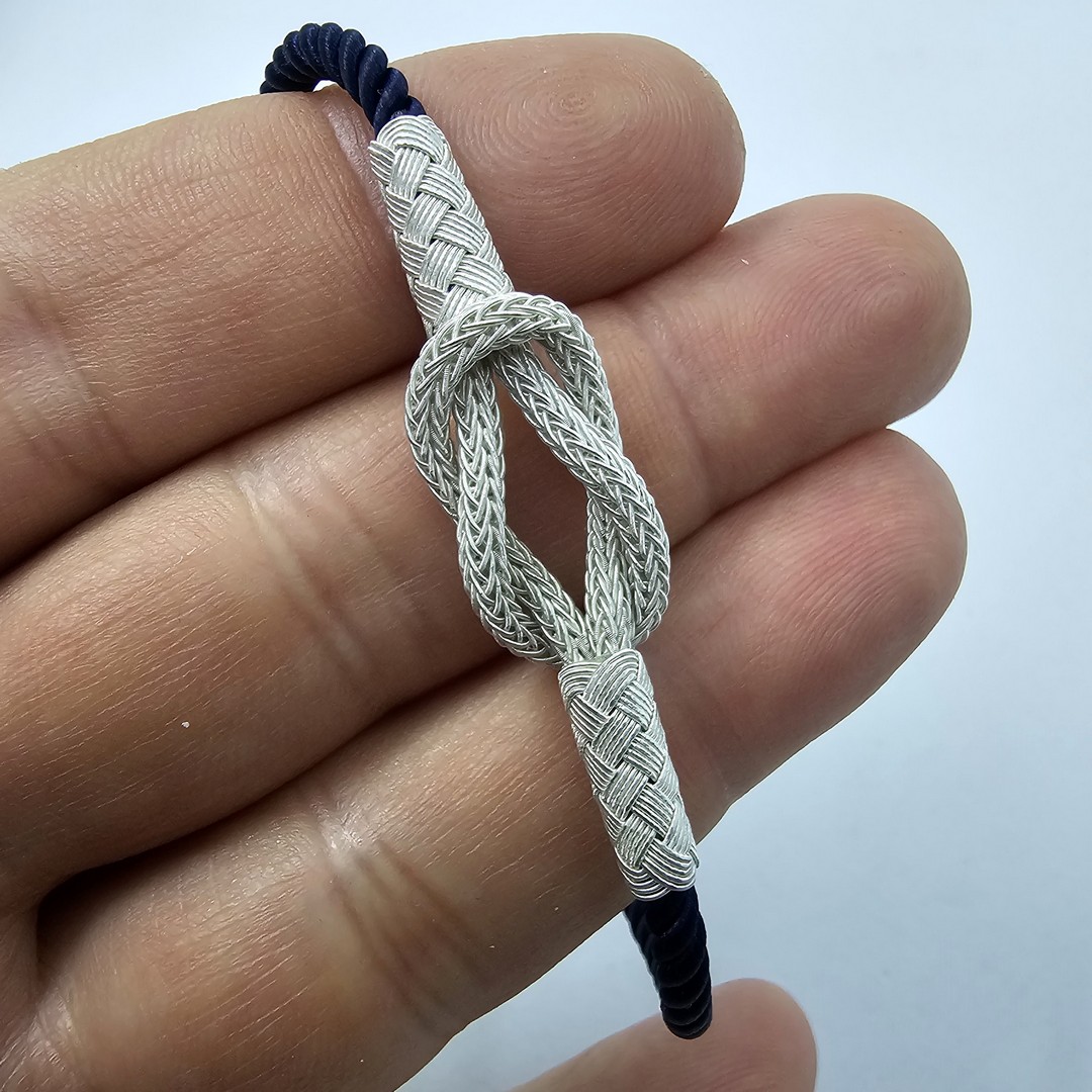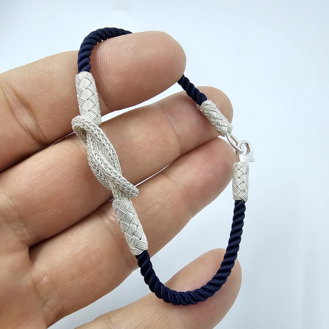 Lacivert İpli Gemici Düğümü Gümüş Kazaziye Bileklik BL066, geleneksel kazaziye sanatının zarafetini modern bir tasarımla birleştiren şık ve özel bir aksesuardır. Tamamen el işçiliği ile özenle hazırlanan bu bileklik, 999 ayar gümüş kullanılarak üretilmiştir. Gümüşün doğal parlaklığı ve kalitesi, bilekliğe hem lüks bir görünüm hem de uzun ömürlü bir kullanım sunar. Lacivert ip detayı, bilekliğe hem canlılık hem de şıklık katarak her türlü kombinasyonla uyum sağlar. Gemici düğümü motifi, sevgi, bağlılık ve sonsuzluğu simgeleyen evrensel bir semboldür, bu da ürünü özel günler ve hediye seçenekleri için ideal kılar.