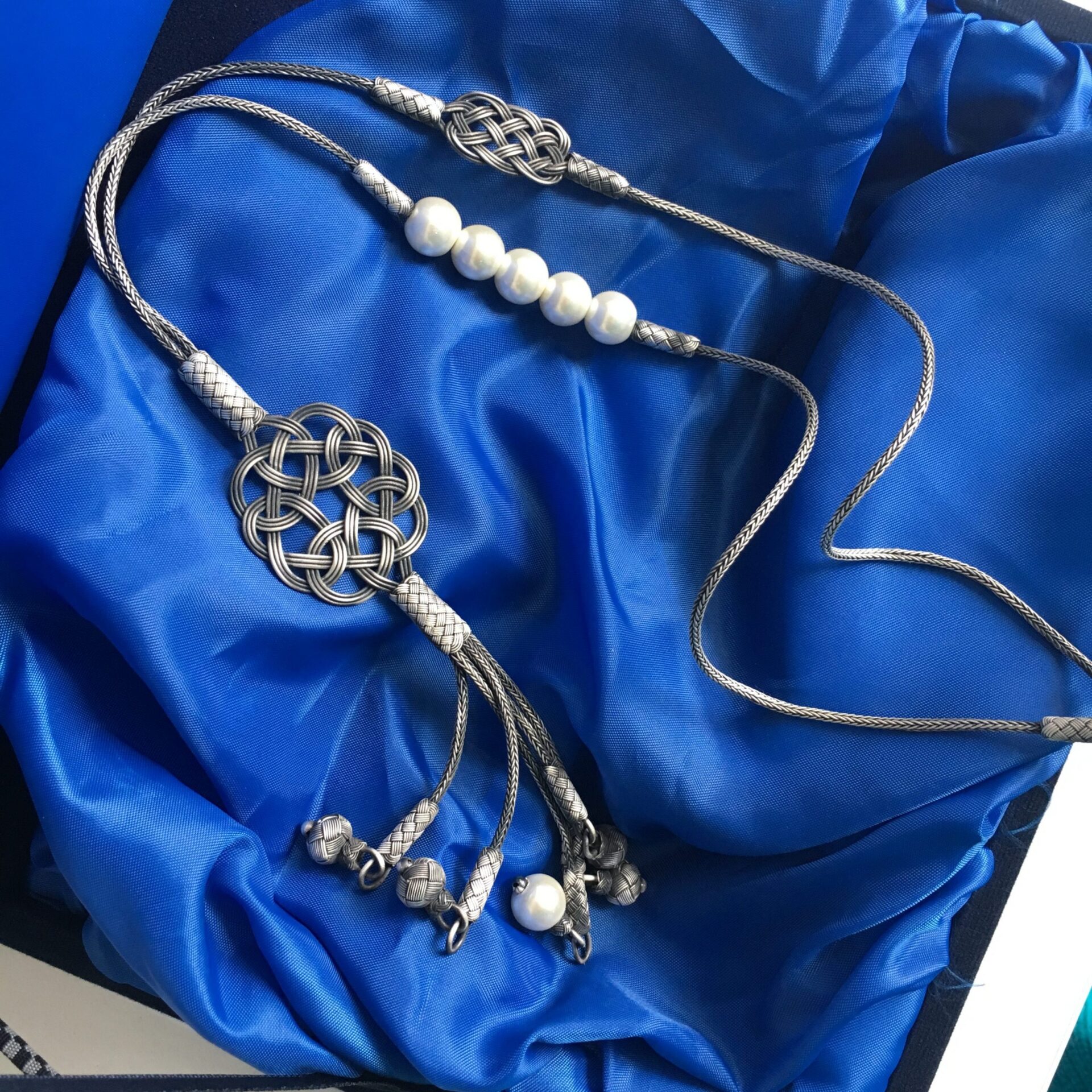 Şıklığınızı tamamlayacak Özel Tasarım İncili Eskitme Gri Gümüş Kazaziye Kolye KL001, 999 ayar saf gümüşten özenle üretilmiştir. Geleneksel Kazaziye sanatının inceliklerini yansıtan bu kolye, eskitme gri tonu ve zarif incili tasarımıyla dikkat çekiyor. El işçiliğiyle işlenen her bir detay, bu kolyeyi eşsiz kılıyor.