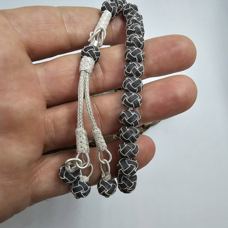 999 ayar gümüşten el işçiliğiyle üretilen bu tesbih, siyah-beyaz renk uyumu ve üçlü püskül tasarımıyla şıklığı öne çıkarıyor. Hem kullanım hem de koleksiyon için ideal.